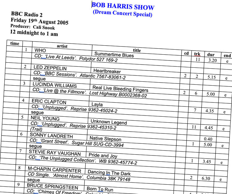 Show playlists & scripts signed by Whispering Bob › Friday Programme, 19th August 2005 Image 1 of 1 Friday Programme, 19th August 2005 £40.00 This was a "Dream Concert" special.This is a signed copy (or original document if selected and available) of a “show playlist” from one of Bob’s shows. Purchase Added! This was a "Dream Concert" special.This is a signed copy (or original document if selected and available) of a “show playlist” from one of Bob’s shows. Take a look at the full running order for this show on the Bob harris Archive Take a look at the full running order for this show on the Bob harris Archive